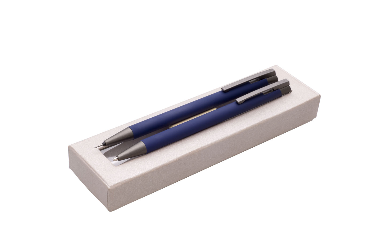 Dárková sada modré propisky a mikrotužky s pogumovaným povrchem a šedými doplňky v luxusním dárkovém pouzdru s průhledným okénkem.