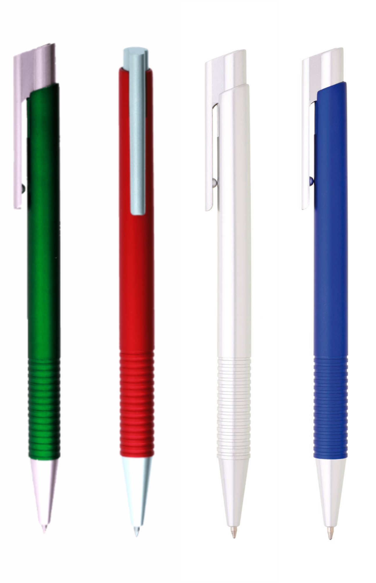 Modrá, plastová propiska se stříbrnými doplňky.