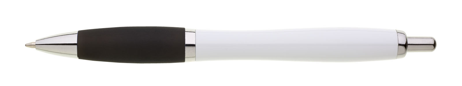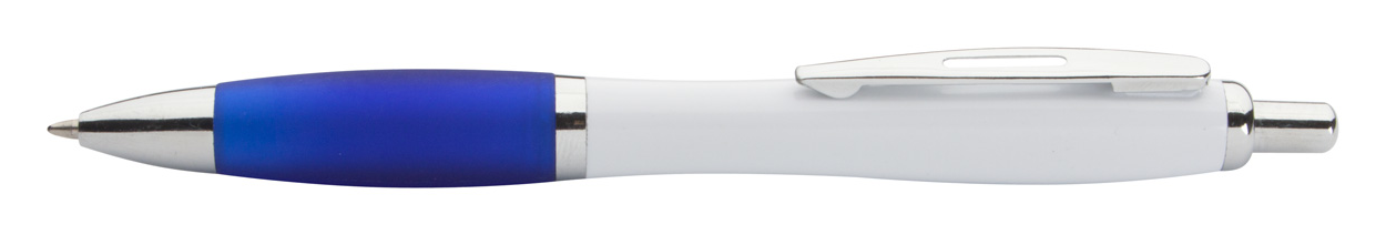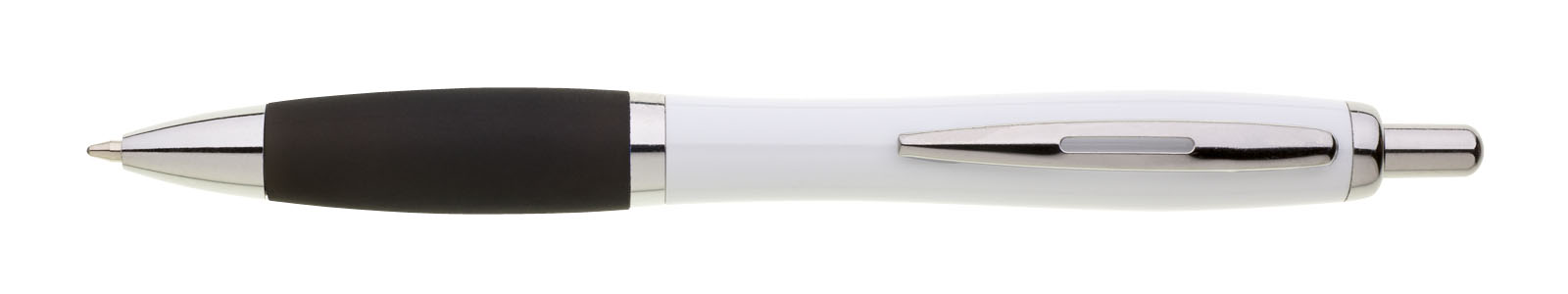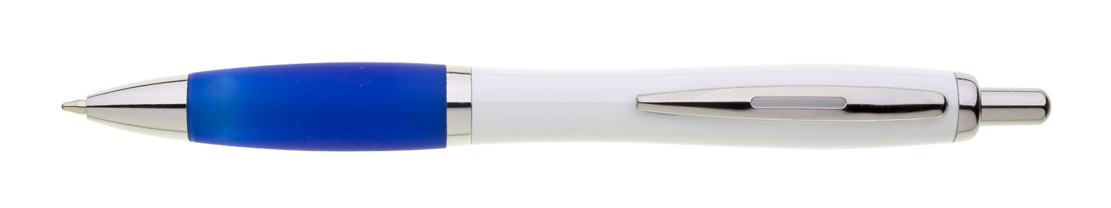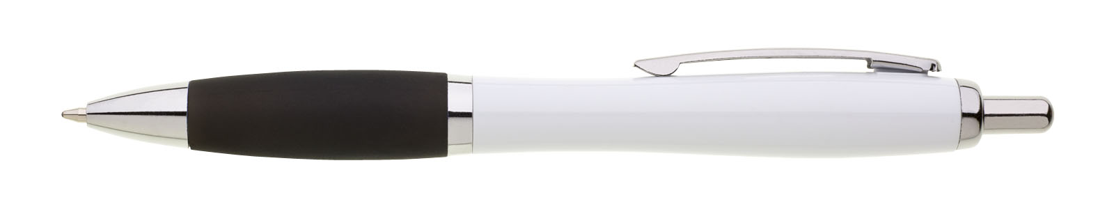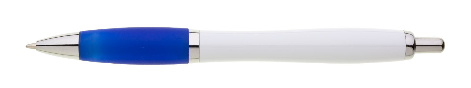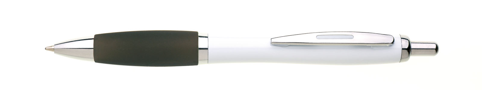 Plastové propisovací pero JESI s bílým tělem. Barva pogumovaného úchopu je oranžová. Ostatní doplňky jsou stříbrné. Náplň je velkoobsahová, modře píšící.