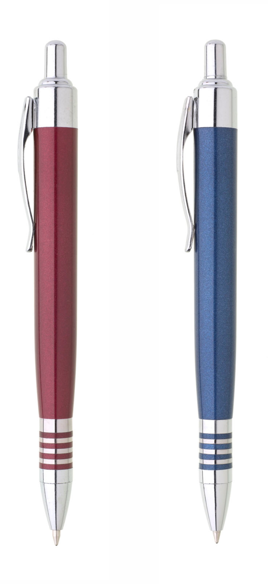 Červené zužující se metalické tělo se čtyřmi dekorativními proužky na úchopu, stříbrné doplňky. Náplň gelová velkoobsahová, modře píšící.
