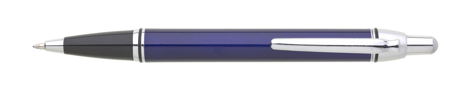 Modrá metalická propiska je doplněna černou špičkou a stříbrnými doplňky. Náplň gelová velkoobsahová, modře píšící.