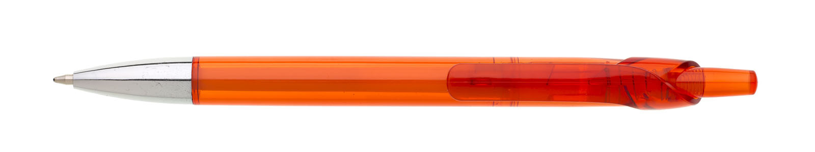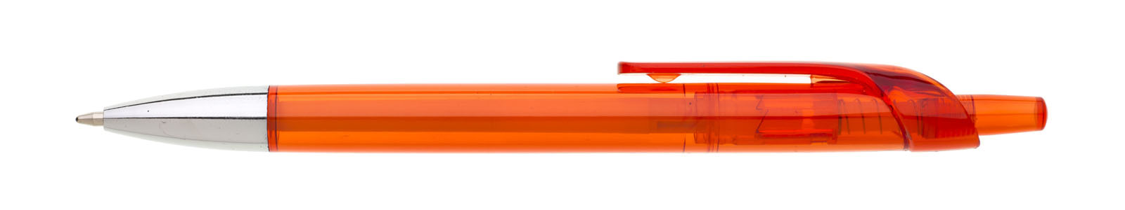 Plastová propiska NODO červená, její tělo i klip je z průhledného plastu, jen špička pera je z pochromovaná.