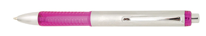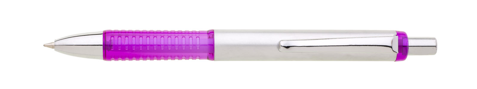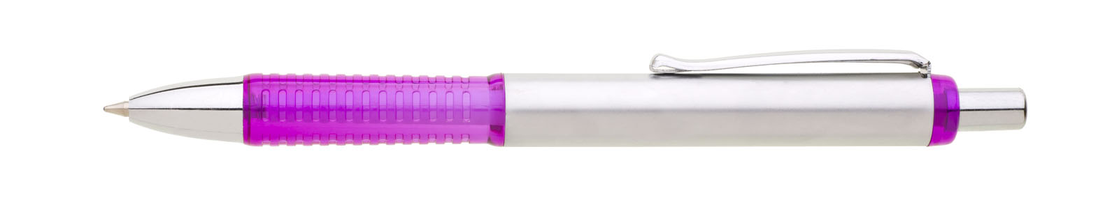 Propiska s hliníkovým tělem a fialovým plastovým úchopem. Náplň velkoobsahová, modře píšící.