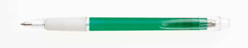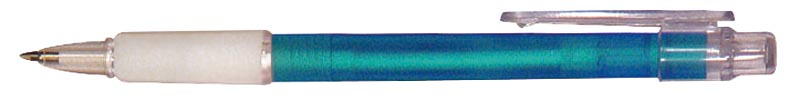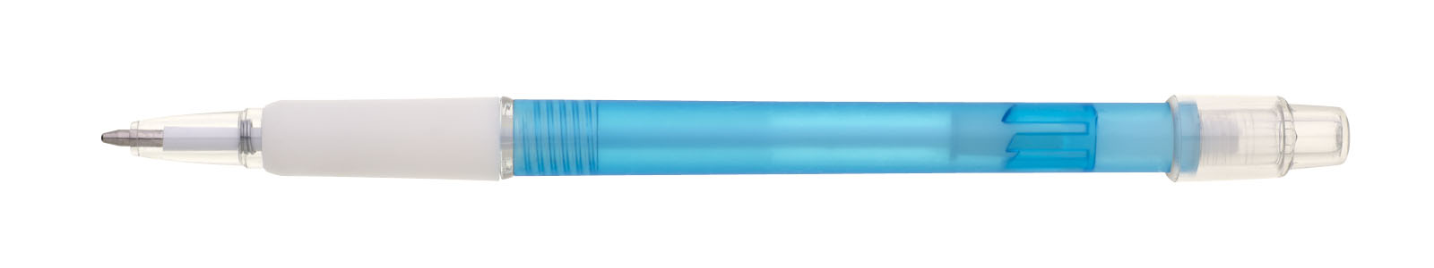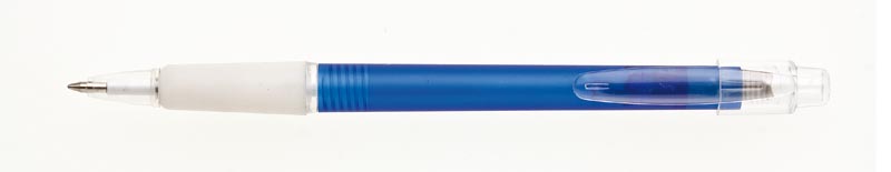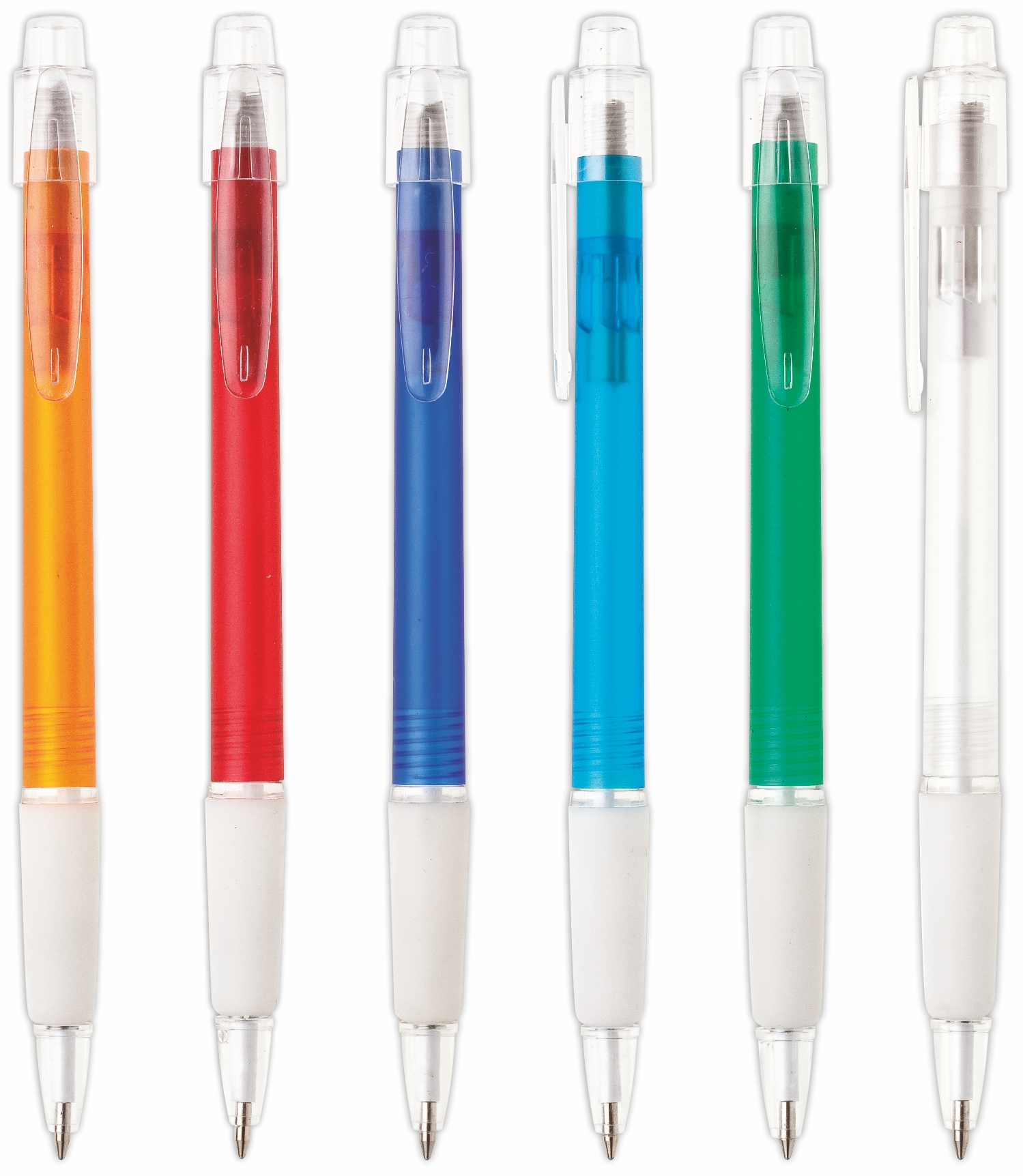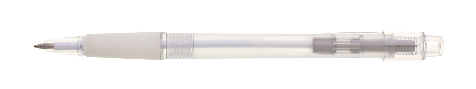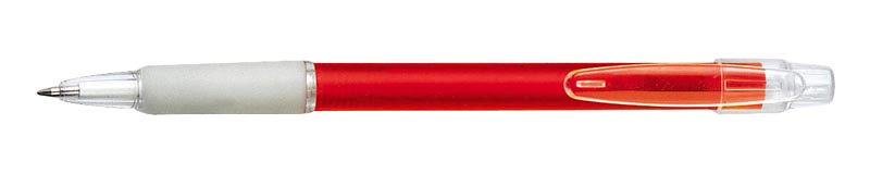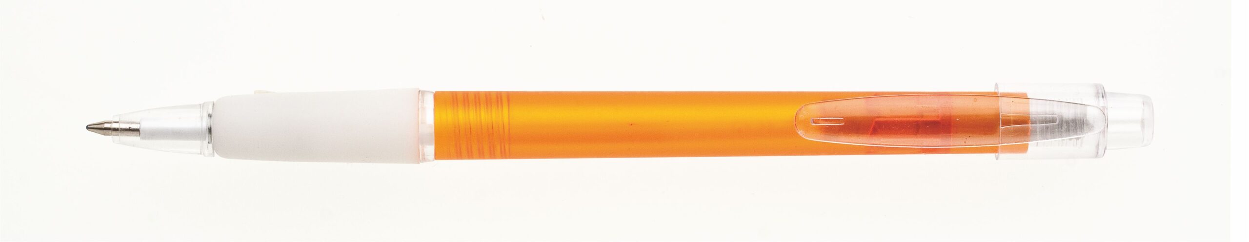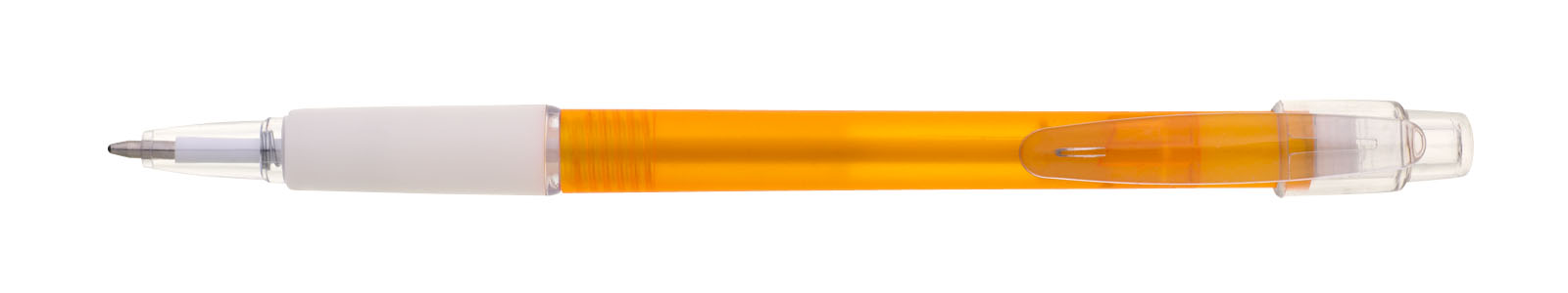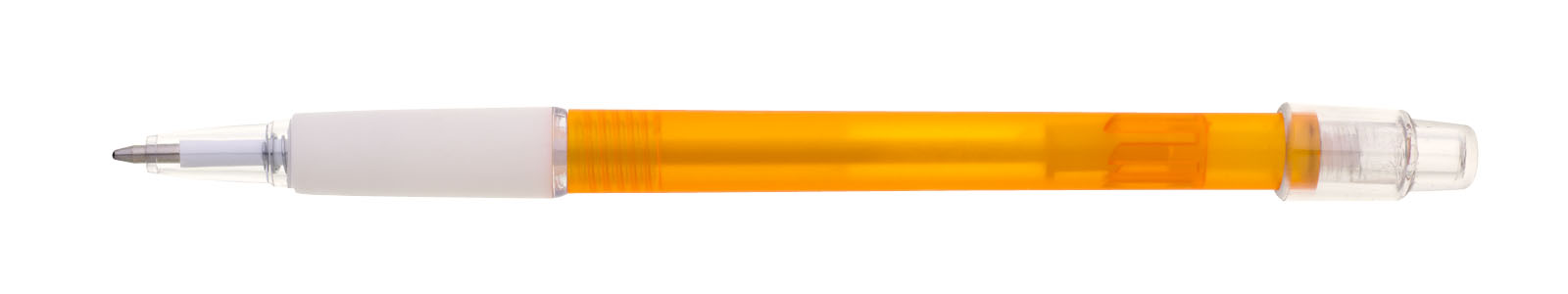 Kuličkové transparentní pero PROSTO. Má gumový úchop, tělo pera je oranžové. Klip a špička pera je průhledná.Náplň je X20, modře píšící.