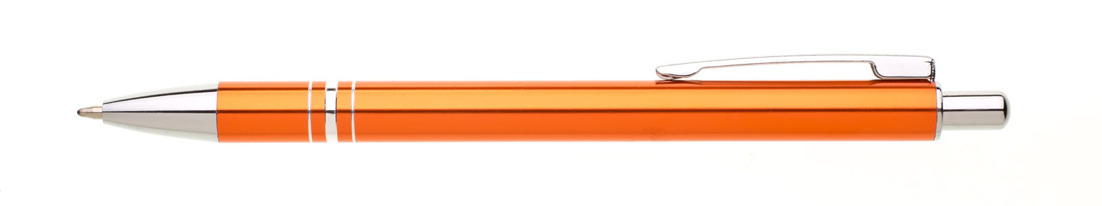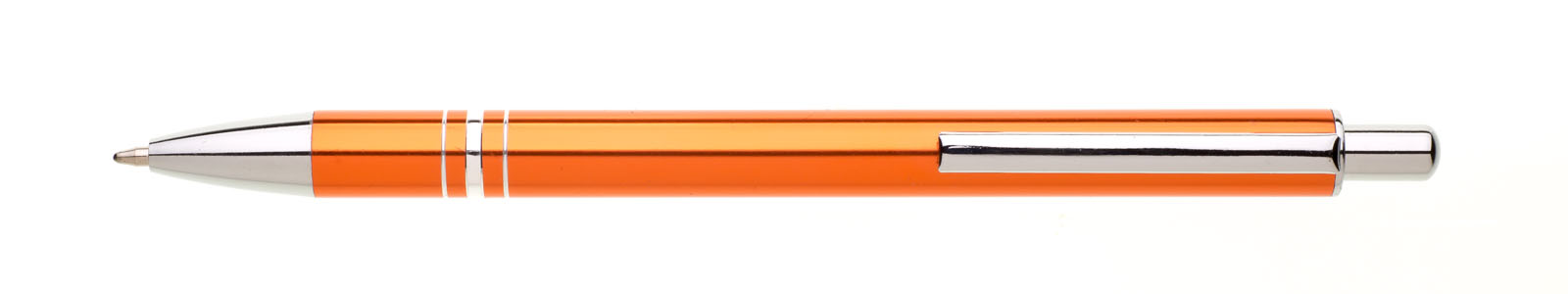 Kuličkové pero RENZA NEW s novým klipem je vyrobeno z hliníku, je v oranžové barvě, na úchopové části má 3 stříbrné proužky. Tužka má pochromované doplňky jako jsou špička, klip a cvakátko. Náplň X 20 – 10,7 cm, modře píšící.