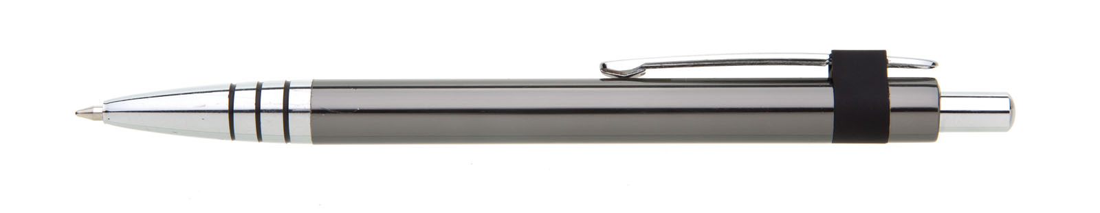 Kovová propiska s lesklým povrchem, se třemi proužky na úchopové části, klip je pochromovaný. Kolekce GABRIELIS.