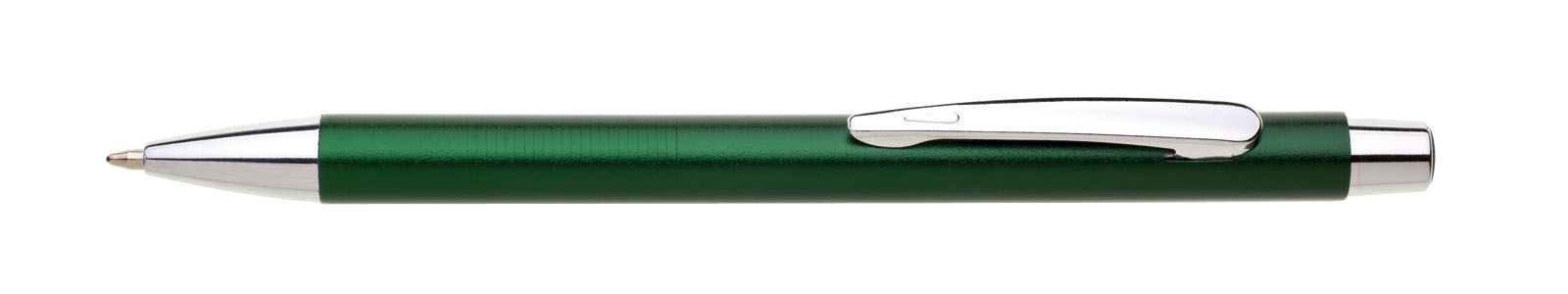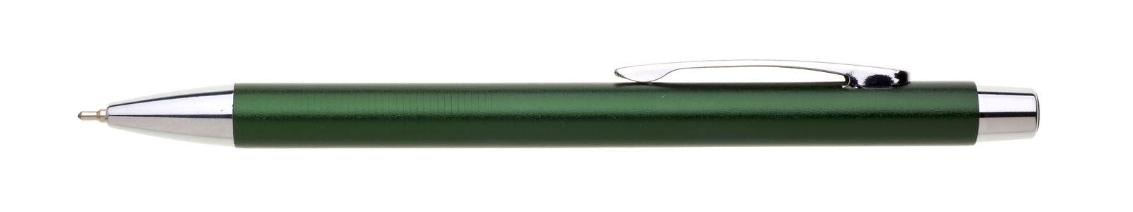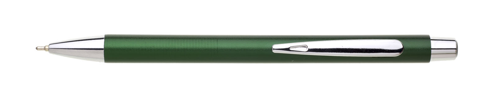 Kovová propiska v zelené, matné metalické barvě, rovné hladké tělo je na úchopu jemně vroubkované. Stříbrné chromové doplňky. Náplň X20, modře píšící.