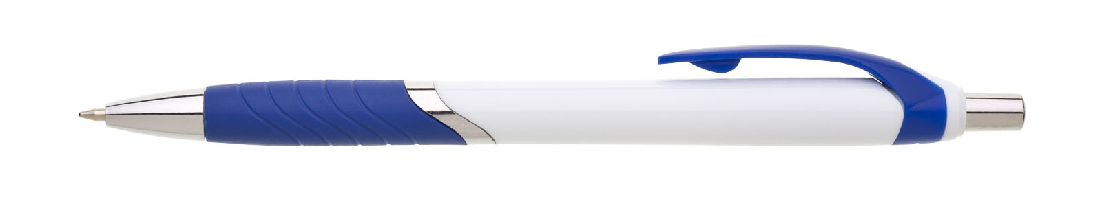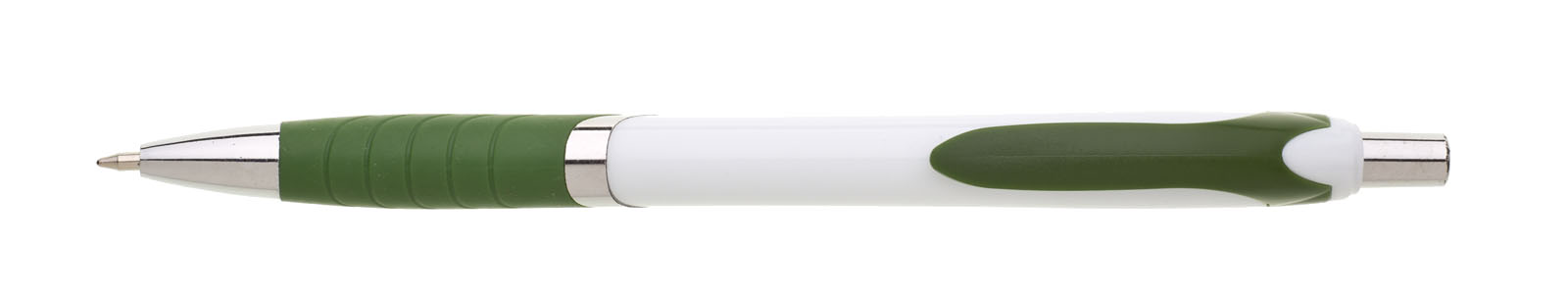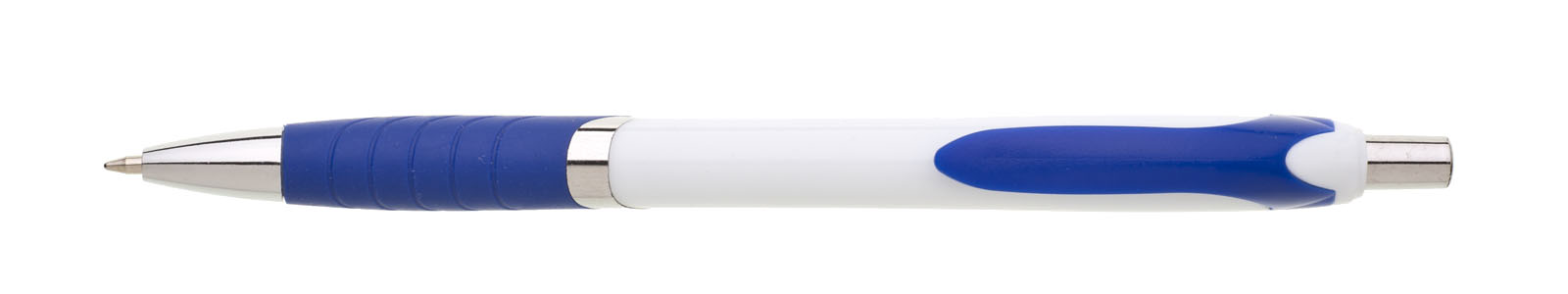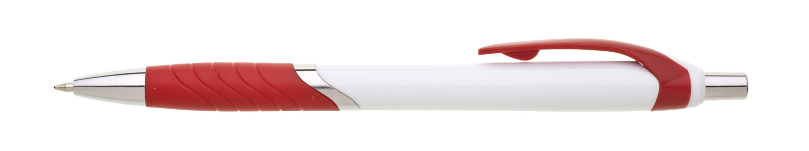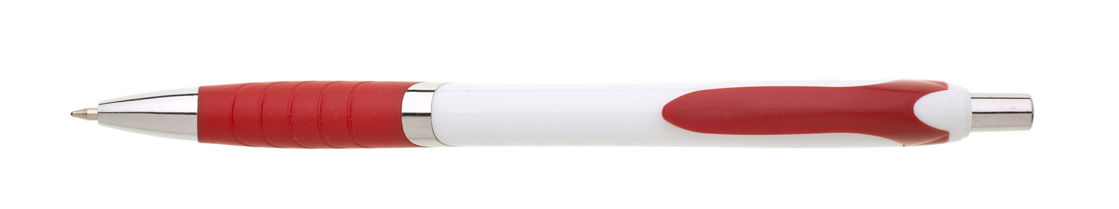 Plastová propiska s bílým tělem s červeným úchopem a klipem a stříbrnými doplňky. Černě píšící.
