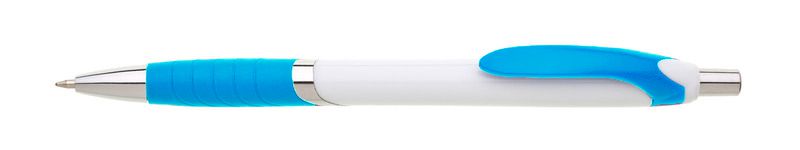 Plastová propiska s bílým tělem s žlutým úchopem a klipem a stříbrnými doplňky.