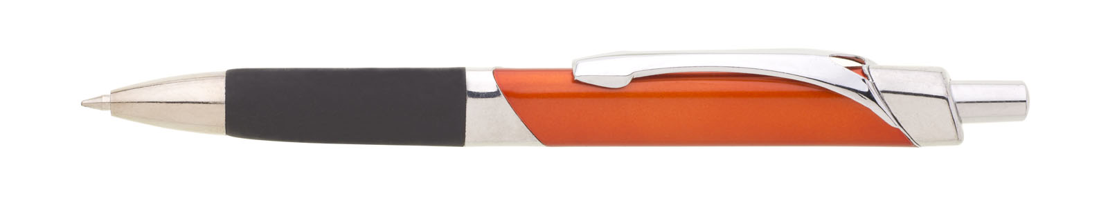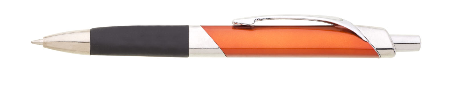 Plastová propisovací tužka ZERBA . Tužka má oranžové tělo. Úchop je černý, pogumovaný. Tělo a úchop je dělen ozdobným, šikmým proužkem. Klip je zdoben výřezem ve tvaru šipky. Náplň tužky je velkoobsahová, modře píšící.
